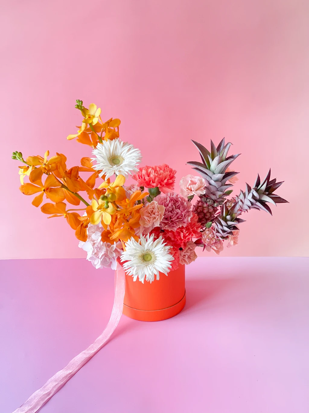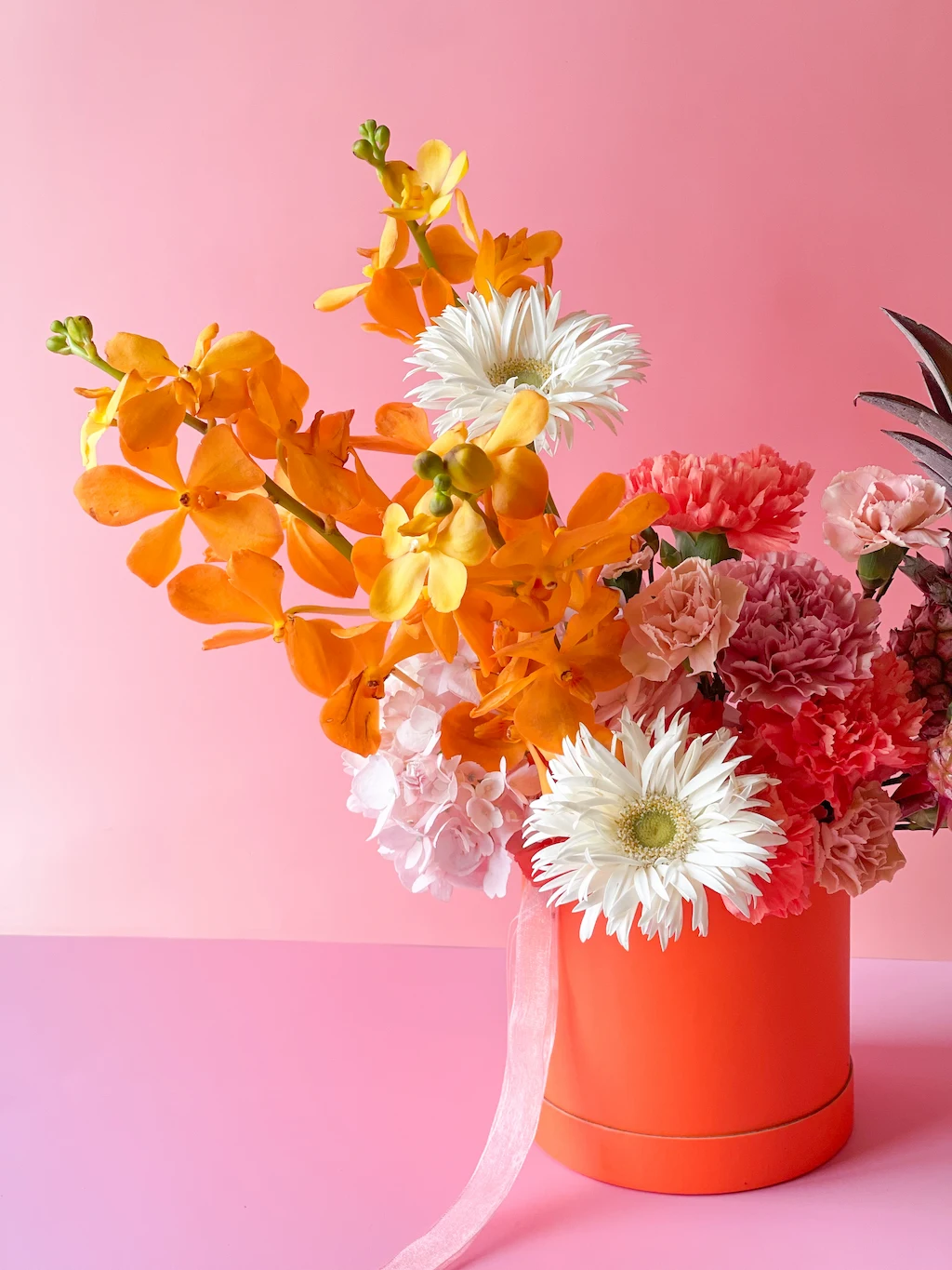 O Flora Rara é uma curadoria do extraordinário, um arranjo construído a partir das flores mais exóticas, excêntricas e inesperadas que chegaram ao estúdio naquela semana. Abacaxis ornamentais da família das Bromeliaceae, orquídeas híbridas tropicais, flores que não existem na natureza sem a intervenção da ciência, espécimes que viajaram continentes para chegar a esta caixa.