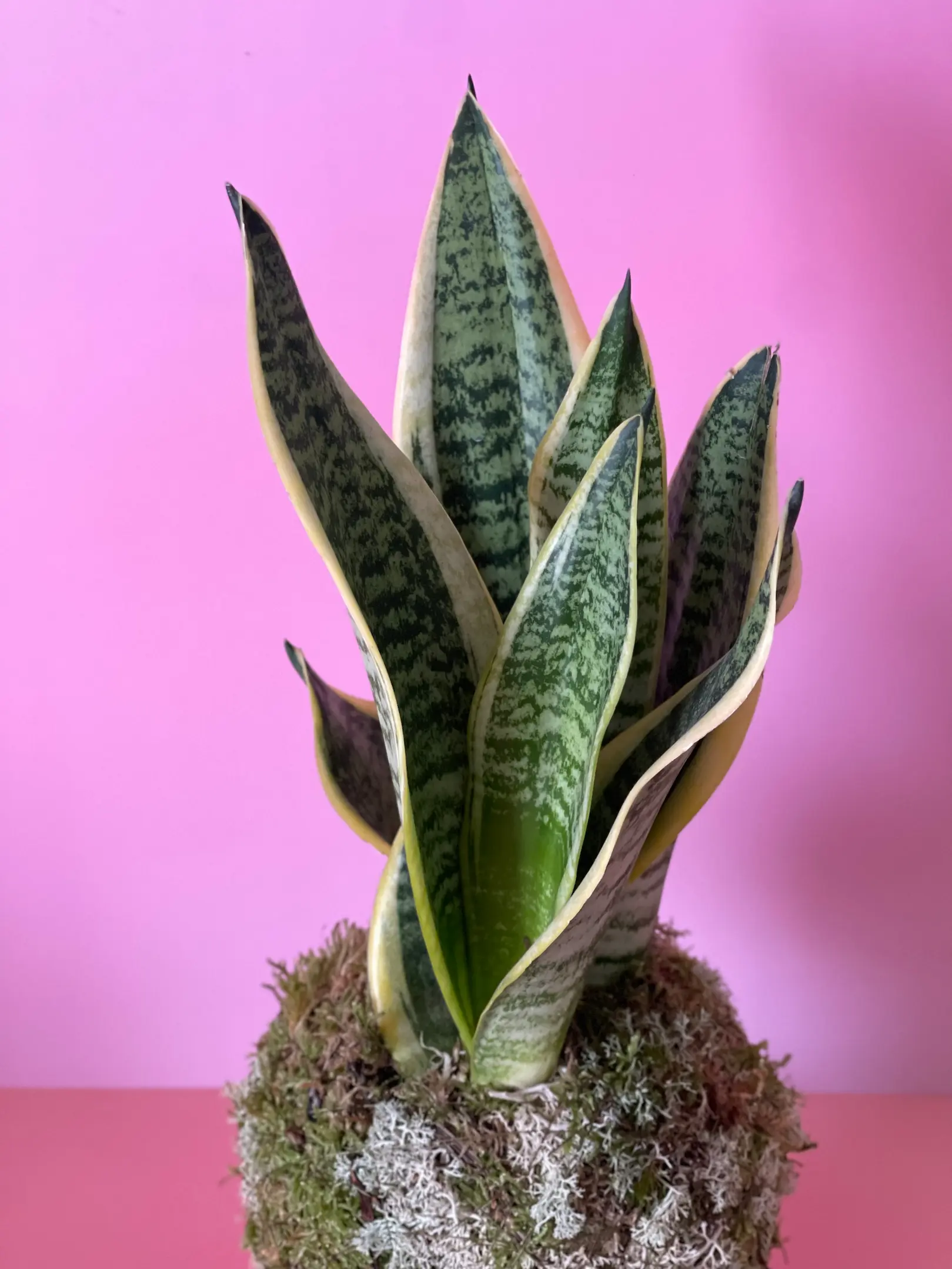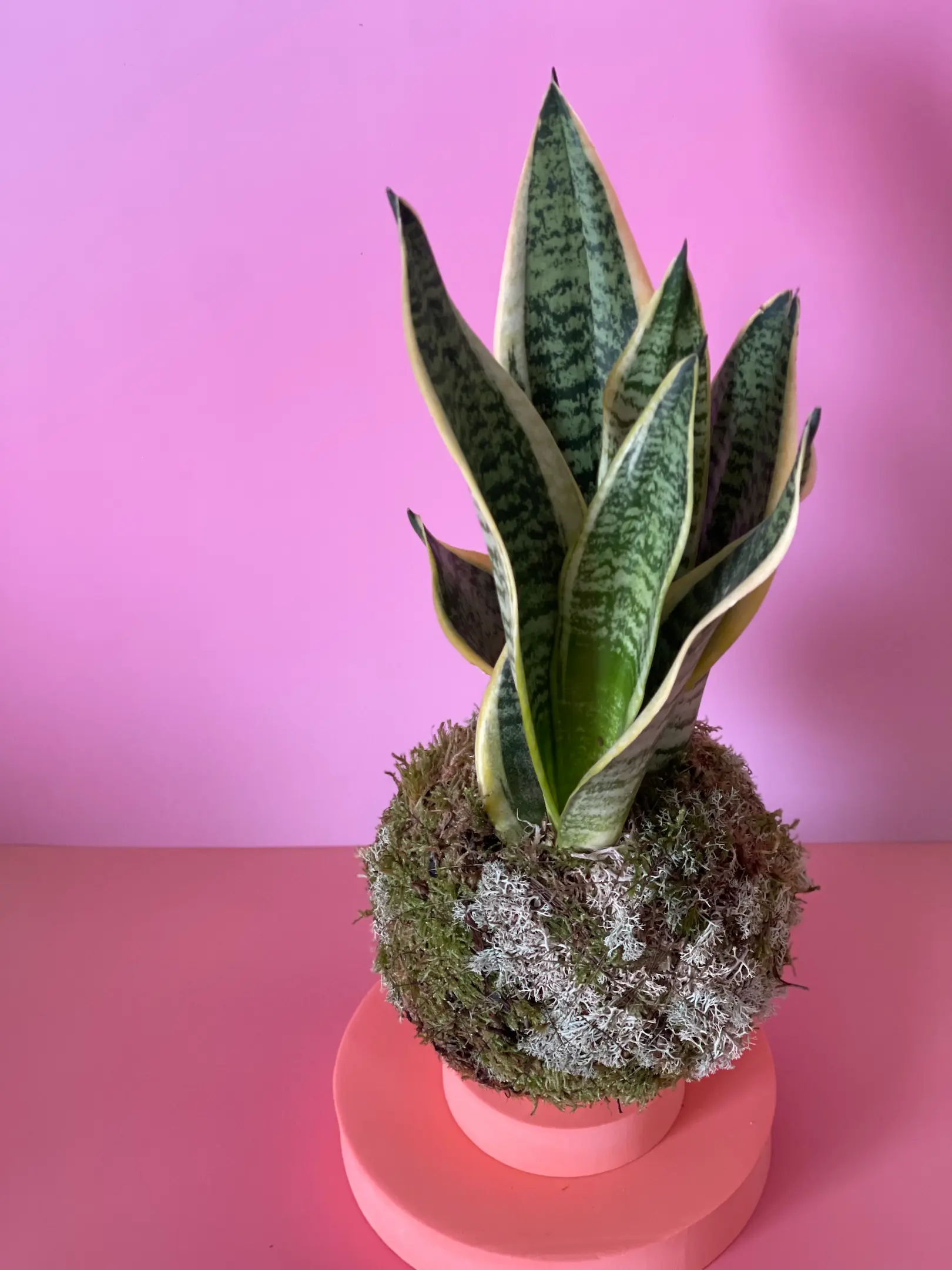 Kokedama de Espada de Santa Bárbara (Sansevieria trifasciata ‘Laurentii’), o amuleto botânico de proteção mais poderoso. Esta planta de interior é tradicionalmente usada para afastar energias negativas e proteger espaços, sendo ideal para entradas de casa, escritórios ou quartos.