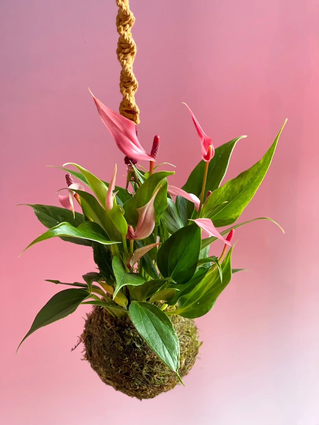 A Kokedama Suspensa de Antúrio Lilli Pink é uma criação artesanal que une a técnica japonesa da kokedama ao macramê, resultando numa obra botânica que é simultaneamente planta, escultura e presente.