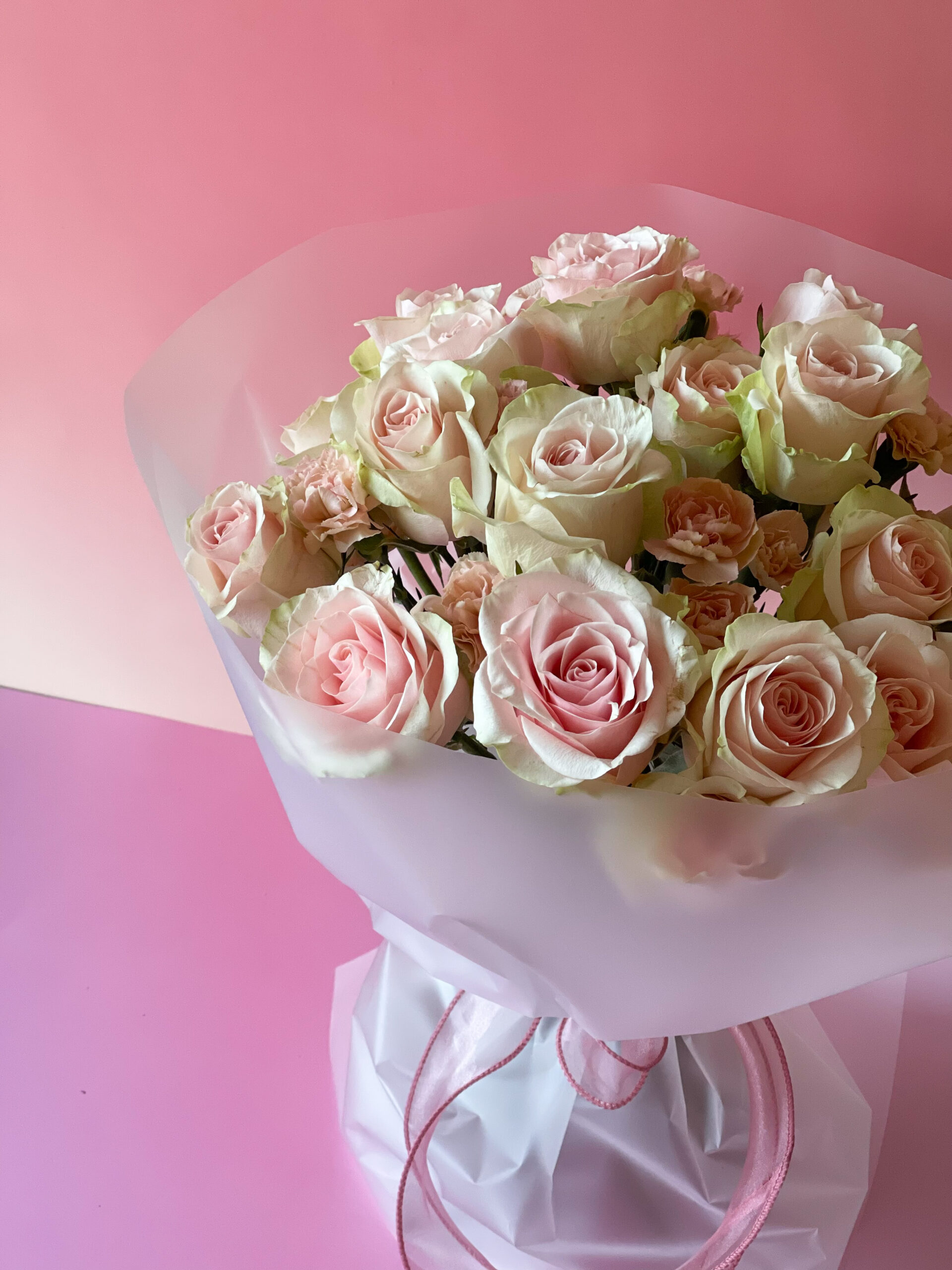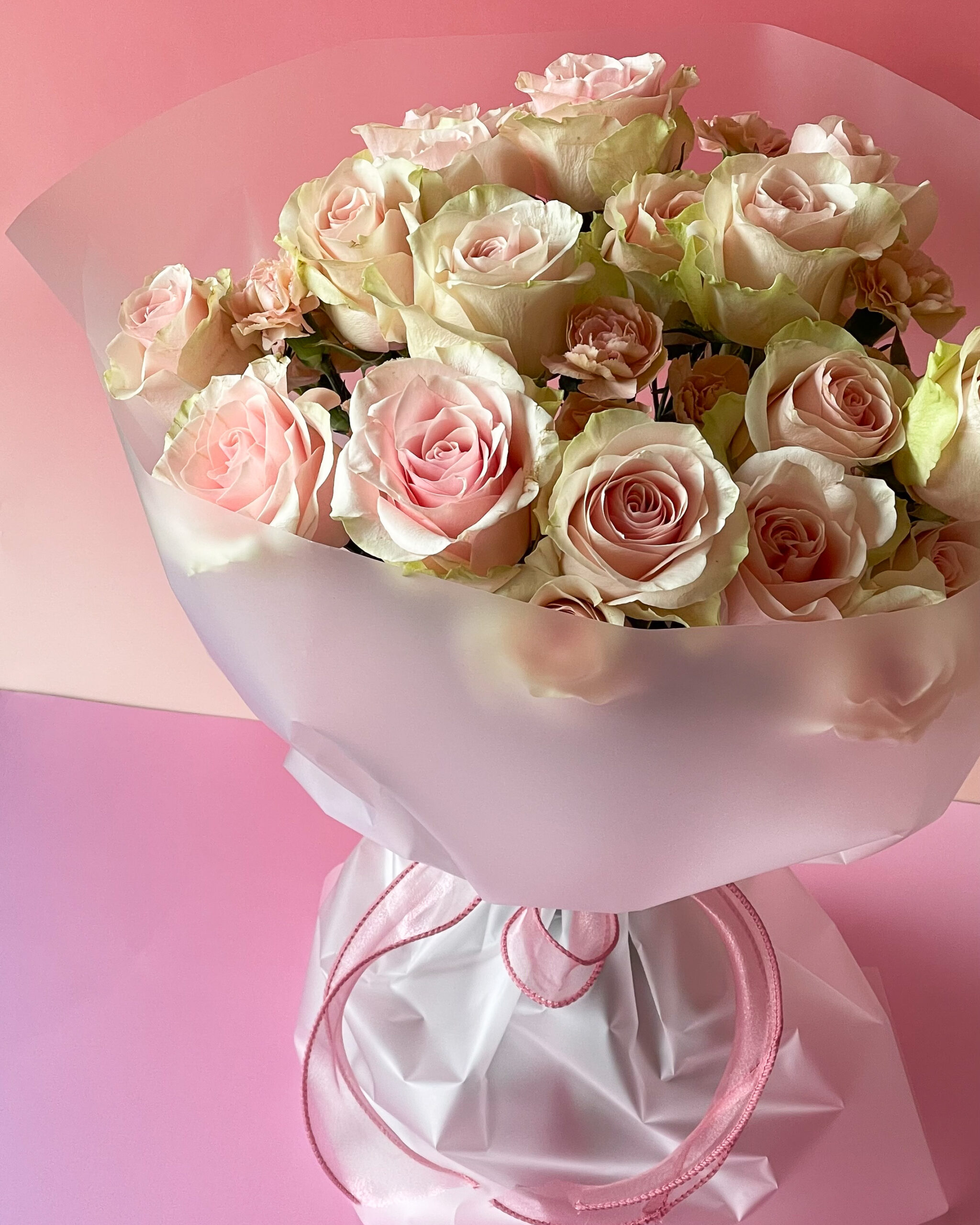 floral pensada para emocionar. Este bouquet de rosas reúne tons românticos que vão do blush suave ao rosa